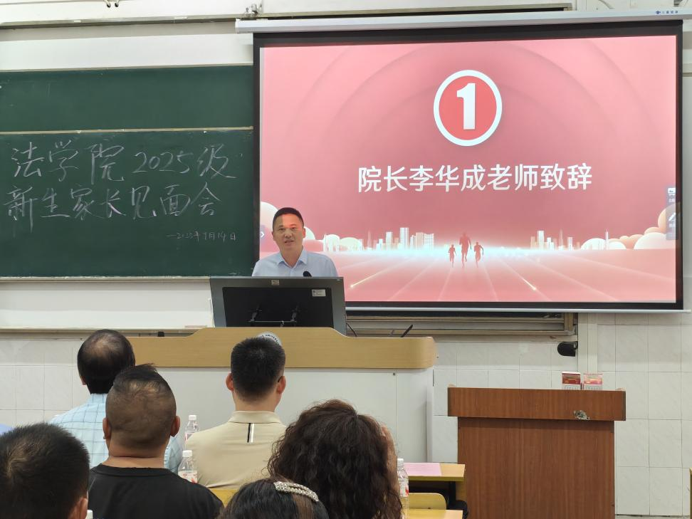 会议伊始,法学院院长李华成登台致辞,向远道而来的新生家长致以热烈欢迎。他围绕学科建设成果、优质师资队伍、人才培养亮点三大维度,系统介绍了法学院的发展现状,生动展现出学院在新时代法学教育浪潮中的强劲实力与鲜明特色。李院长强调,当前法学教育需紧密贴合社会需求,着力培养兼具扎实法治素养与过硬实践能力的复合型人才;同时寄语新生,希望他们在大学期间深耕专业知识、锤炼综合本领,以青春之力投身法治建设事业,书写无愧于时代的青春篇章。