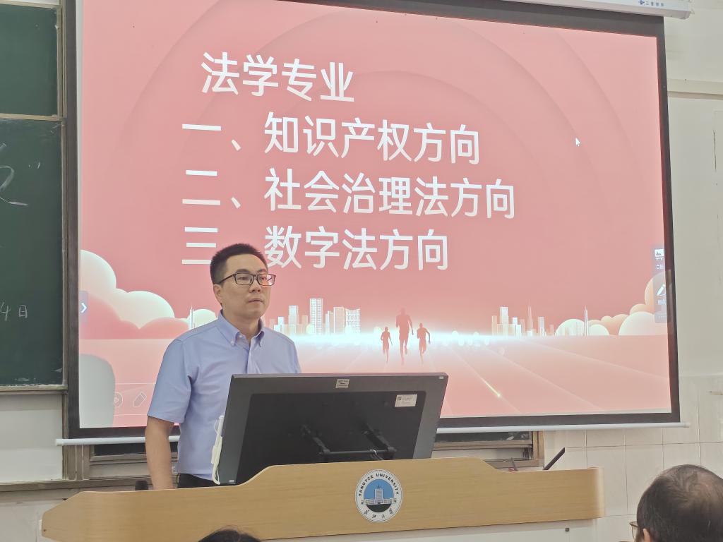 随后,法学院本科生教学副院长杨春磊聚焦本科生人才培养方案展开深入解读。他重点介绍了法学专业下设的知识产权、社会治理法、数字法三大特色培养方向,从课程体系构建、实践教学安排、学术资源支撑等方面进行详细阐释,尤其强调了英语四六级考试对学业发展与未来就业的重要性。