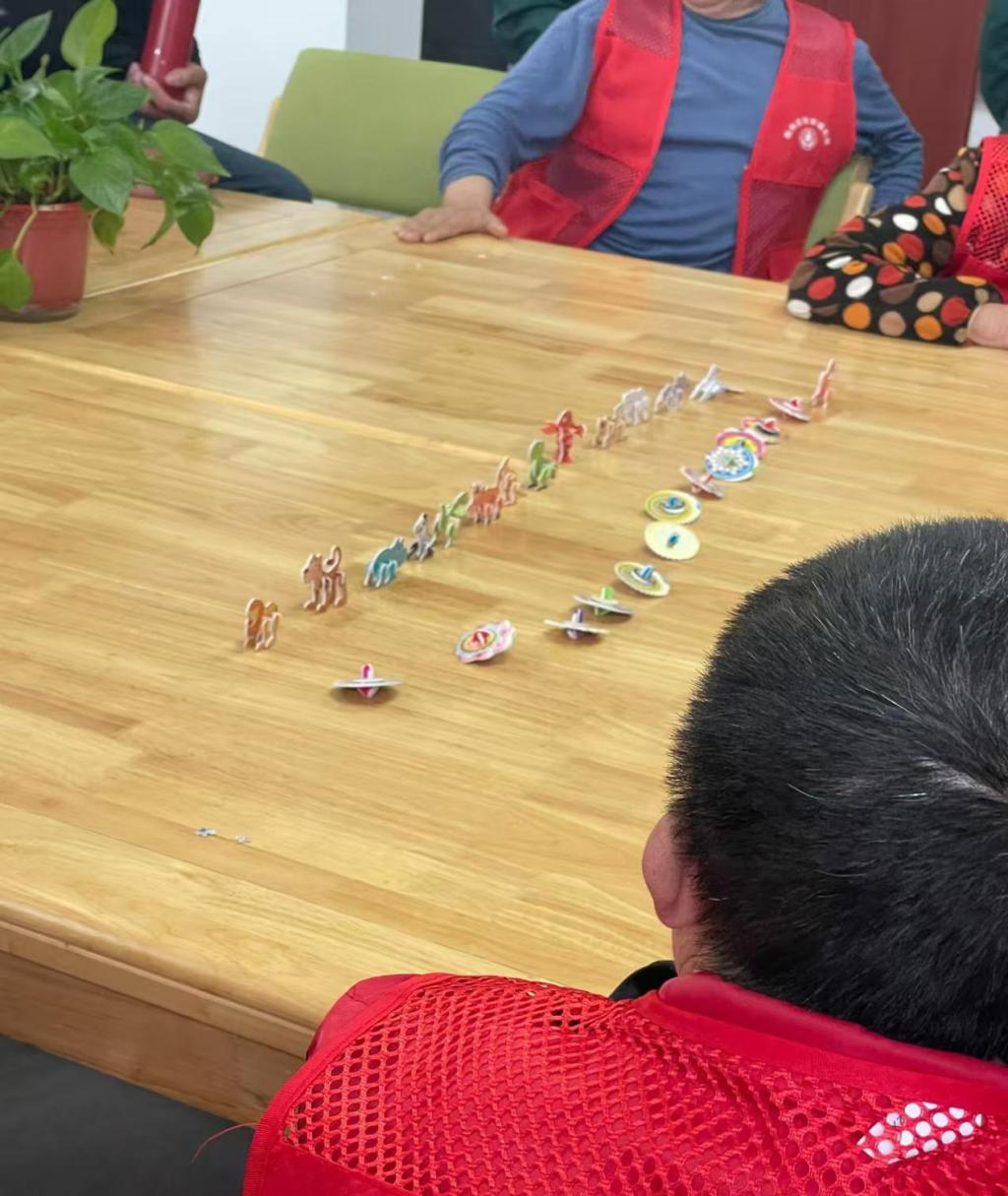 活动伊始,志愿者们带领老人们在大厅做起了十五分钟健身操,伴随着轻快的音乐,老人们舒展筋骨,脸上洋溢着笑容。随后移步书法室,志愿者们手把手教老人们折纸陀螺,彩纸翻飞间,欢声笑语不断。