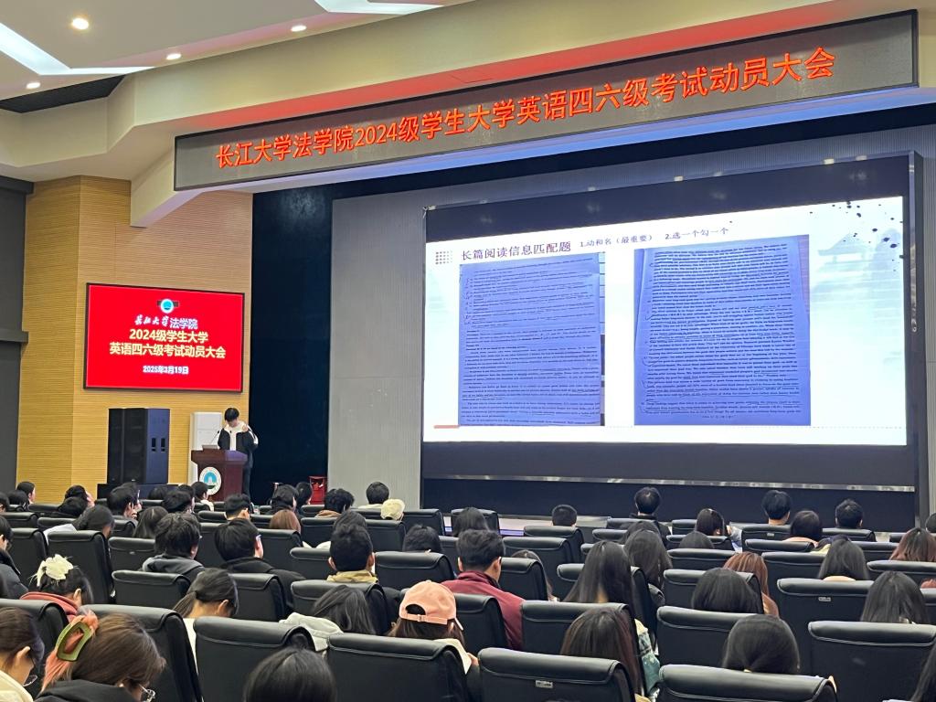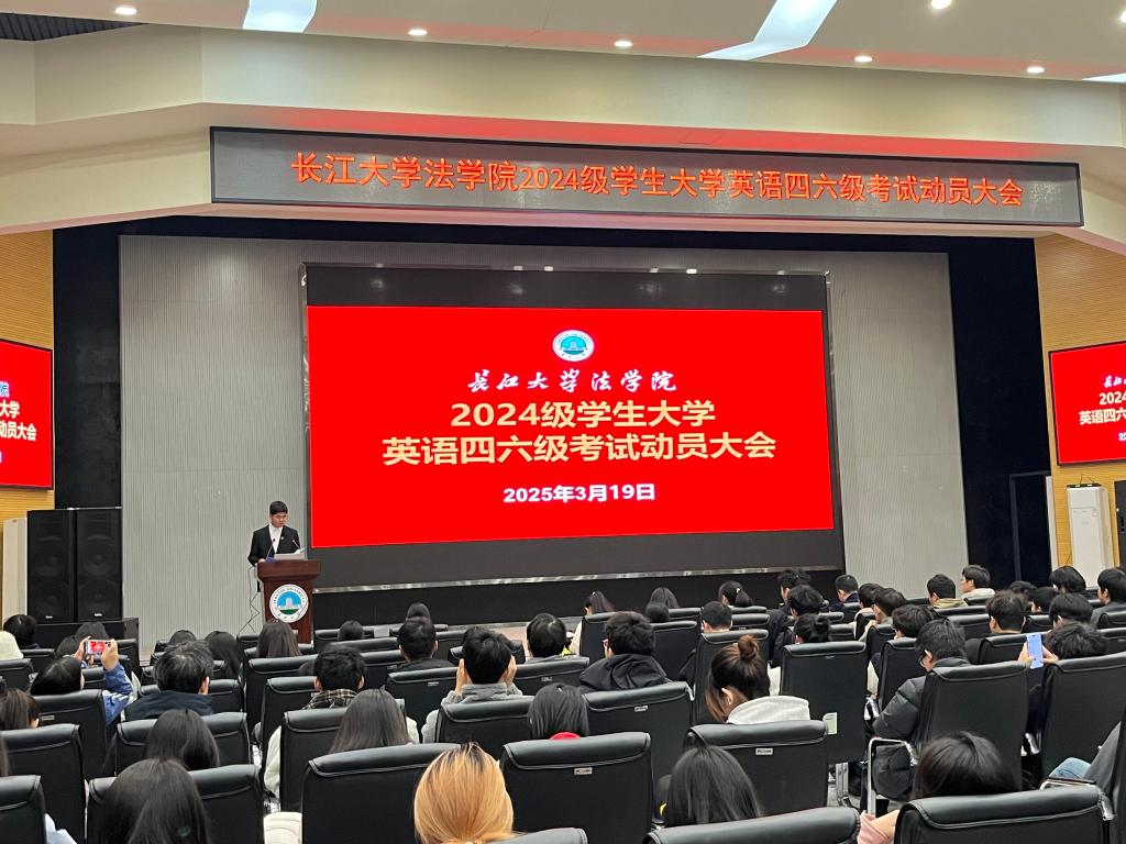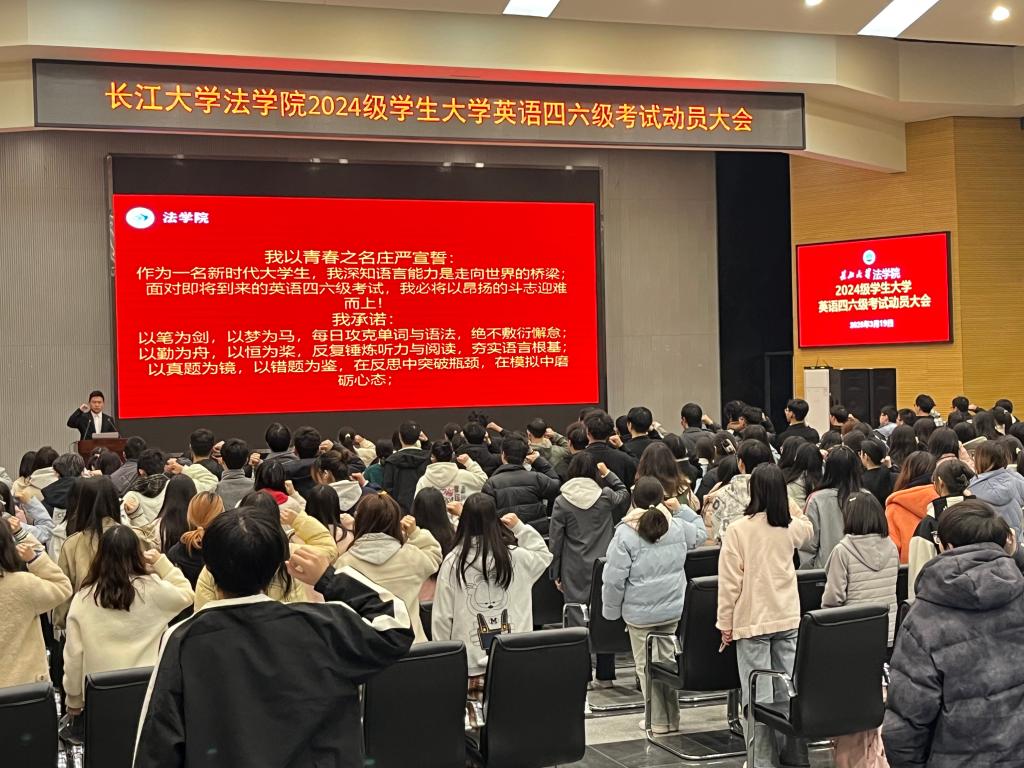 (通讯员 向若涵)3月19日,法学院在西校区农科大楼1058学术报告厅召开大学英语四六级考试动员大会,2024级全体学生参加会议。大会以“明法致公强根基,语通世界展锋芒”为主题,通过学生榜样经验分享、集体宣誓、领导动员等环节,点燃了学子们的备考热情,为即将迎战四六级考试的全体学生注入了强大精神动力。