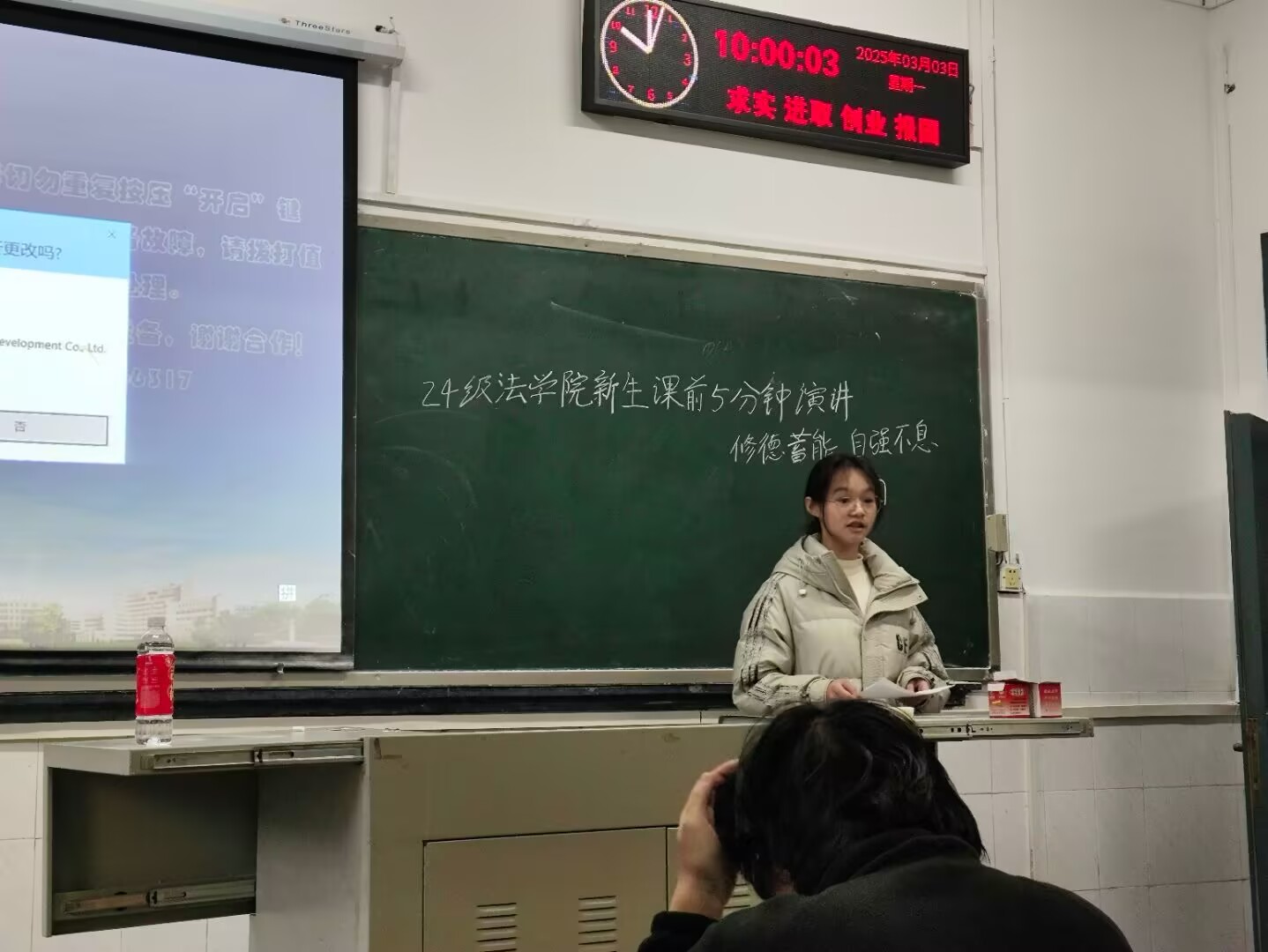 (通讯员 邹妮彤)3月3日至7日,长江大学法学院开展了春季学期第三周课前5分钟小演讲活动,本次活动以“修德蓄能 自强不息”为主题,旨在激励法学院学子在学业和未来职业生涯中坚守道德准则,不断提升专业能力,秉持自强精神。
