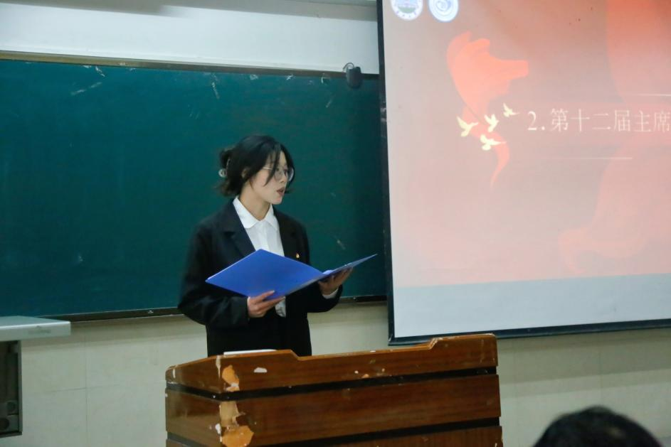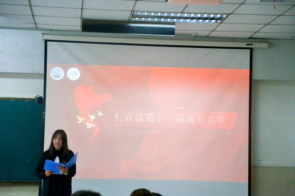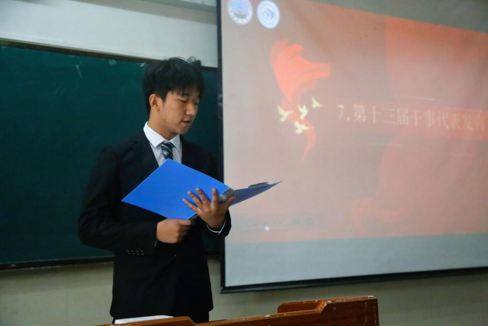 会议第三项,吴老师宣读了第十三届团委学生会全体成员名单,对新成员的加入表示热烈欢迎。会议第四项,第十三届团委学生会主席团代表胡曦禾及干事代表张航发言,从汲取前人智慧,坚定理想信念以及计划工作事宜等方面,以昂扬的风貌,铿锵的语气,全方位展现出新一代学生会成员的朝气与活力。