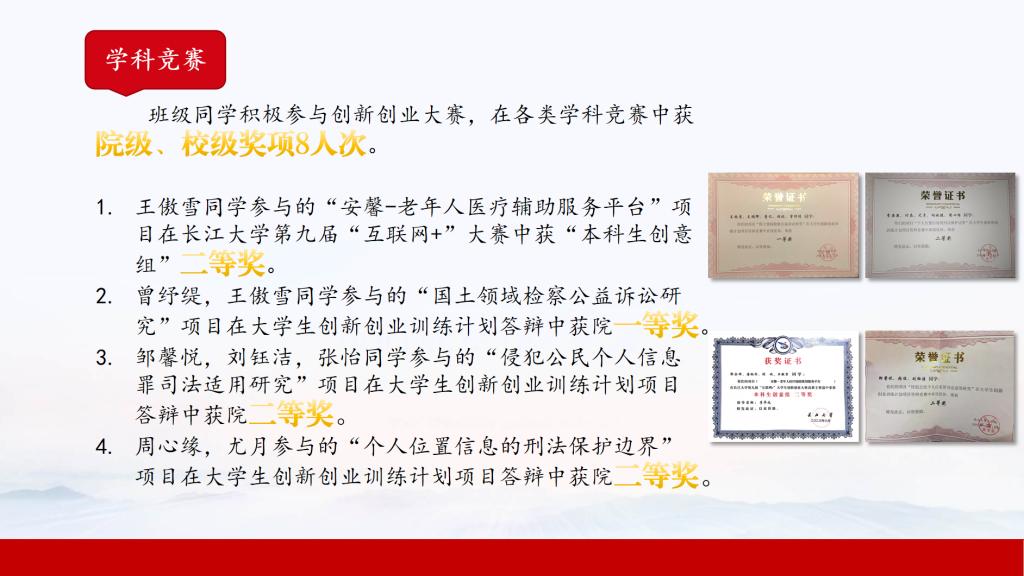 在英语学习方面,法学12204班同样取得了骄人的成绩。班级英语四级一次性通过率高达97%,大部分同学继续备考英语六级、词达人竞赛、大英赛等,展现出了他们对英语学习的热情和决心。在各类学科竞赛中,他们也是屡获殊荣,获得校级以上奖项4人次,班级同学积极参与创新创业大赛,半数以上同学参与过大创项目的研究训练,在各类学科竞赛中获院级、校级奖项8人次。这些荣誉的背后,是他们不懈的追求和拼搏的精神。