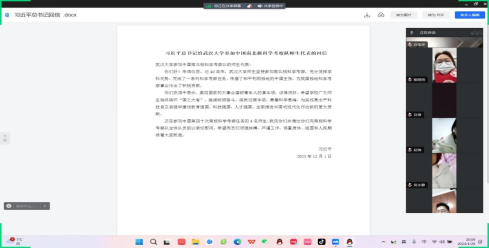 同学们深入学习习近平总书记给武汉大学参加南北极科学考察队师生代表重要回信内容,更深一步地理解习近平总书记对于极地科学考察事业发展成果的赞扬以及殷殷期望。同学们积极联系自身工作、学习实际畅谈体会,纷纷表示将向南极科学考察队全体师生学习,练就过硬本领,顽强拼搏,严谨工作,勇攀科学高峰,用更加昂扬的斗志、饱满的热情担起新时代赋予的使命与责任。