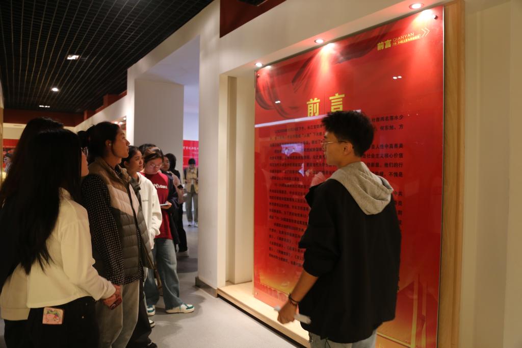 活动伊始,同学们满怀着对英雄先烈崇高的敬意,排好队,迈齐步,走进10.24纪念馆,映入眼帘的是一块块长江大学优秀校友的事迹展板。讲解员刘慧琳饱含深情地讲解着他们的故事,帮助同学们更好地学习优秀校友的事迹。接着,同学们跟随讲解员的脚步来到二楼展厅,由讲解员田家兴、郭奕麟、严安琪共同带领大家了解和学习了“10.24”事件和“人链”精神,同学们听后心中不禁升起浓浓敬意。