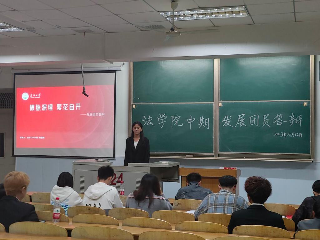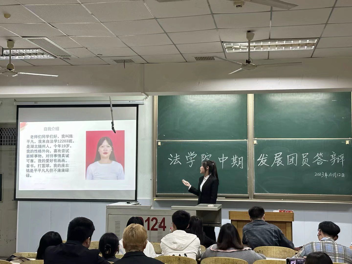 (通讯员欧阳文悦)为切实加强基层团组织建设,规范团员发展流程,保证新发展团员质量,2023年10月12日18时,法学院在13教D区124教室开展了2023年中期发展团员答辩活动。院团委书记雷礼老师、辅导员吴敏老师、法学院第十二届团委学生会主席团以及各位答辩同学参加。