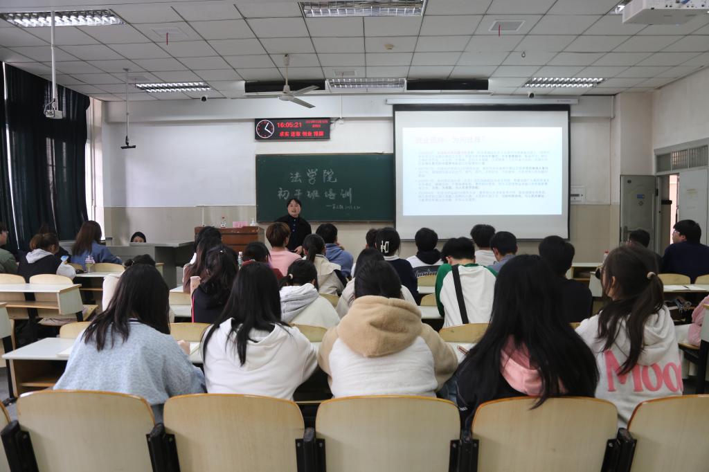 许老师指出,以上地区都是经济发展和政策帮扶的就业前景光明的地区,同学们可以给予优先考虑。在企业选择方面,许老师向大家介绍了“国聘行动”、“启航计划”和“扬帆计划”。她认为,随着互联网大数据就业形态发展,大学生应该乘势而上,把握好因新产业、新业态、新模式蓬勃发展而出现的各种新兴就业模式,积极拓展就业途径,提高大学生就业率。最后,许老师将本次培训内容凝聚成一句话勉励法学院的学生干部:“有理想,敢担当,能吃苦,肯奋斗”。她鼓励同学们在今后择业就业中要树立崇高理想,不懈奋斗,勇于尝试、敢于担当、学会反思、提升自我。