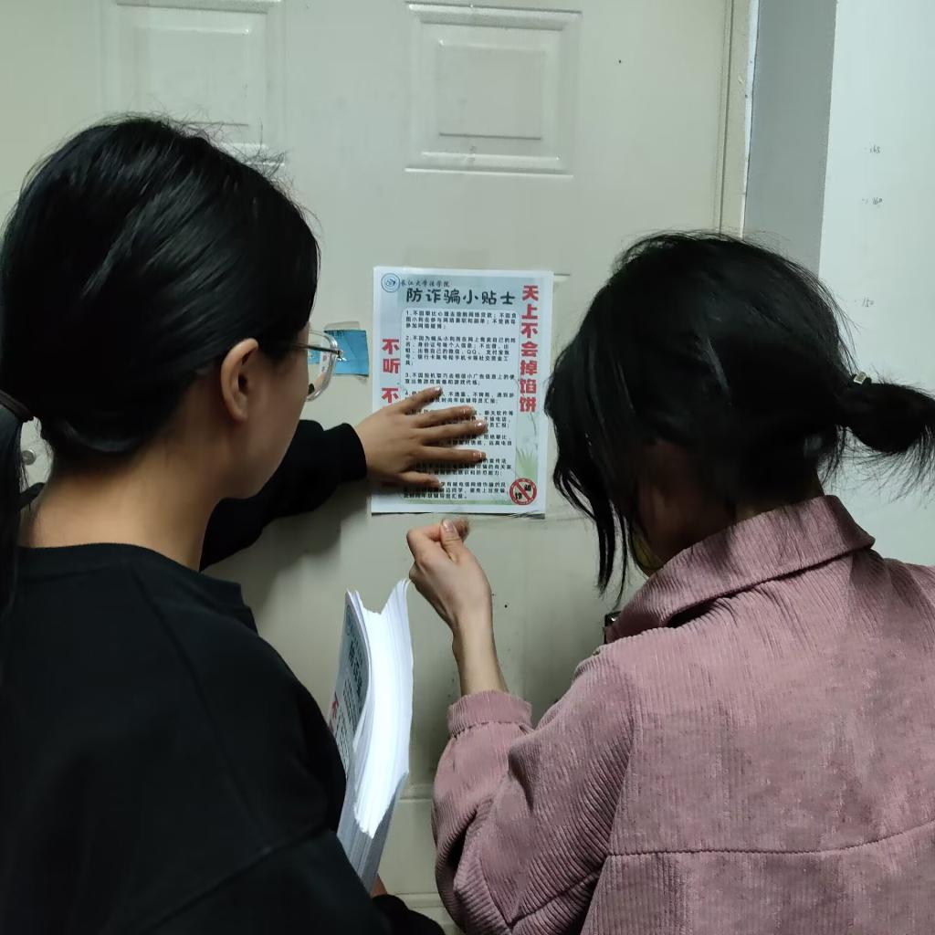 为进一步夯实学生防范诈骗基础工作,让学生了解更多诈骗手段,有效提高学生安全防范意识,杜绝学院诈骗案件的发生。3月15日至3月23日,法学院全体专职辅导员、兼职辅导员每天晚上走进学生寝室、张贴防诈骗宣传单并与学生一一谈心,告诫学生“天上不会掉馅饼、不听不信不转账”,同时要求寝室长落实自己的责任,引导寝室成员从思想上高度重视防诈骗宣传工作。