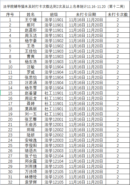 根据学校要求,2022年11月14日——11月20日(第十二周)组织全体本科生进行每日“辅导猫”打卡。经分管辅导员、学工助理、班干部多次提醒,仍有67名同学未在规定时间内完成打卡,具体未打卡次数及日期如下:(表格显示)