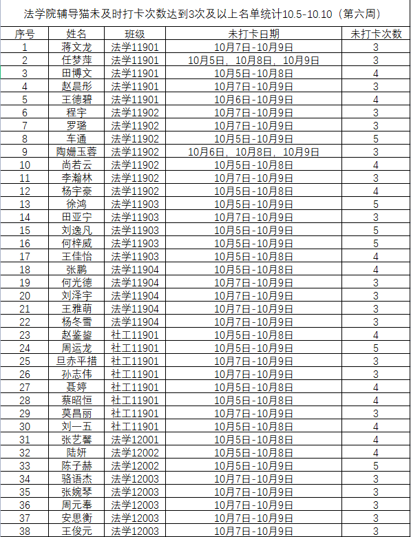 根据学校要求,2022年10月3日——10月9日(第六周)组织全体本科生进行每日“辅导猫”打卡。经分管辅导员、学工助理、班干部多次提醒,仍有38名同学未在规定时间内完成打卡,具体未打卡次数及日期如下:(表格显示)