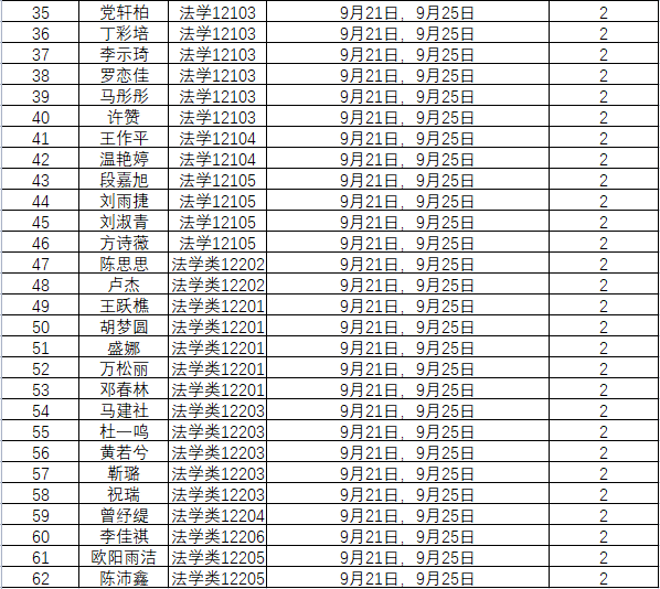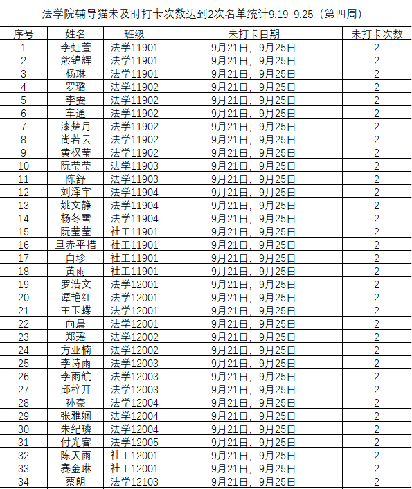 根据学校要求,2022年9月19日——9月25日(第四周)组织全体本科生进行每日“辅导猫”打卡。经分管辅导员、学工助理、班干部多次提醒,仍有62名同学未在规定时间内完成打卡,具体未打卡次数及日期如下:(表格显示)