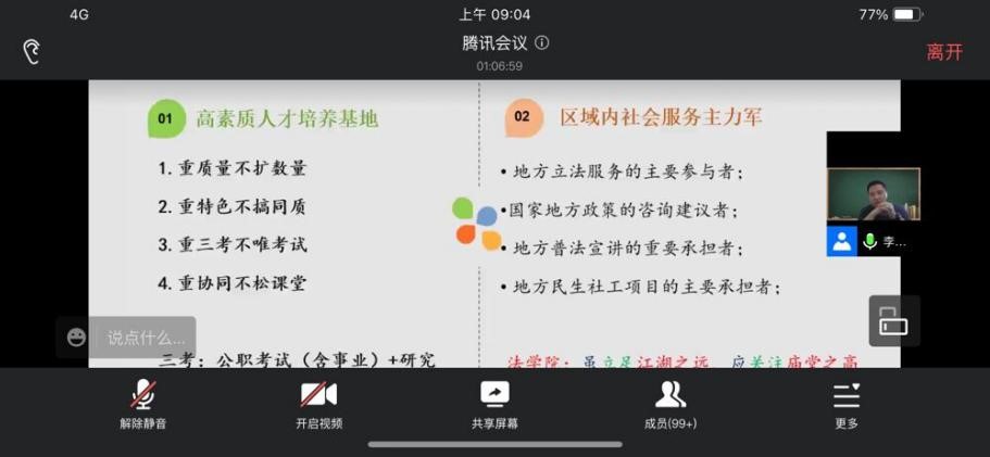 学会认知自我能力,培养大学生涯规划。9月7日下午,法学院开展“法科生学业和职业生涯规划”主题校友交流分享讲座,本次讲座邀请校友余飞老师主讲,在此次分享交流会上,余飞老师希望大家脚踏实地,帮助新生正确认知自我;也鼓励大家仰望星空,引导大家对未来工作世界进行思考和探索,同时帮助树立正确生涯规划理念,培养学生生涯规划的能力。同学们纷纷表示这次讲座让自己对于大学学业了解、未来职业思考等方面意义重大,感觉收获颇丰。