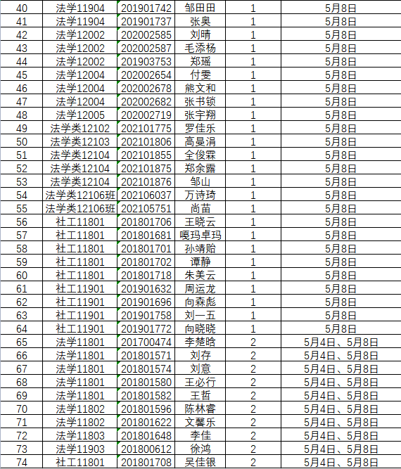 根据学校要求,2022年5月4日、5月8日(第十一周)组织全体本科生进行每日“辅导猫”打卡。经分管辅导员、学工助理、班干部多次提醒,仍有74名同学未在规定时间内完成打卡,具体未打卡次数及日期如下:(表格显示)