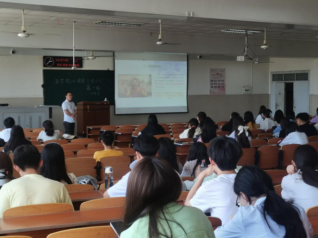 (通讯员 甘宇婷)为深入推进法学院心理健康教育工作,帮助同学们树立良好的心理健康观念,5月5日14时30分我院于东校区12教502开展了第一期心理骨干培训——应激与成长。此次培训由法学院辅导员盛文军老师主讲,18-21级各班班长、团支部副书记、副班长、安全委员、心育委员、寝室长参加此次培训。