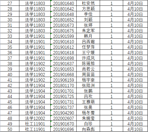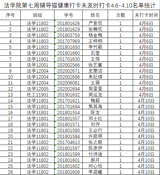 根据学校要求,2022年4月6日、4月10日(第七周)组织全体本科生进行每日“辅导猫”打卡。经分管辅导员、学工助理、班干部多次提醒,仍有50名同学未在规定时间内完成打卡,具体未打卡次数及日期如下:(表格显示)