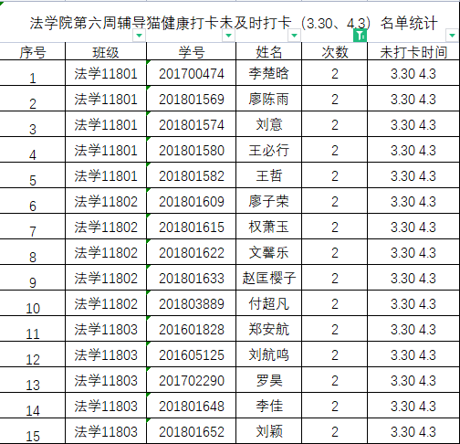根据学校要求,2022年3月30日、4月3日(第六周)组织全体本科生进行每日“辅导猫”打卡。经分管辅导员、学工助理、班干部多次提醒,仍有15名同学未在规定时间内完成打卡,具体未打卡次数及日期如下:(表格显示)