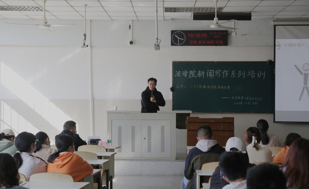 (通讯员 吴诚 徐程)为进一步强化法学院学生新闻宣传综合能力,提升新闻宣传工作素养,法学院组织开展的新闻宣传系列培训第三场于11月13日上午10时,在东校区12教102教室顺利开展。本次培训由人文与新媒体学院陈周世博主讲,法学院辅导员周晓峰莅临指导,徐程同学主持,法学院第十届团委学生会全体成员、社团学生干部及班委代表参加。
