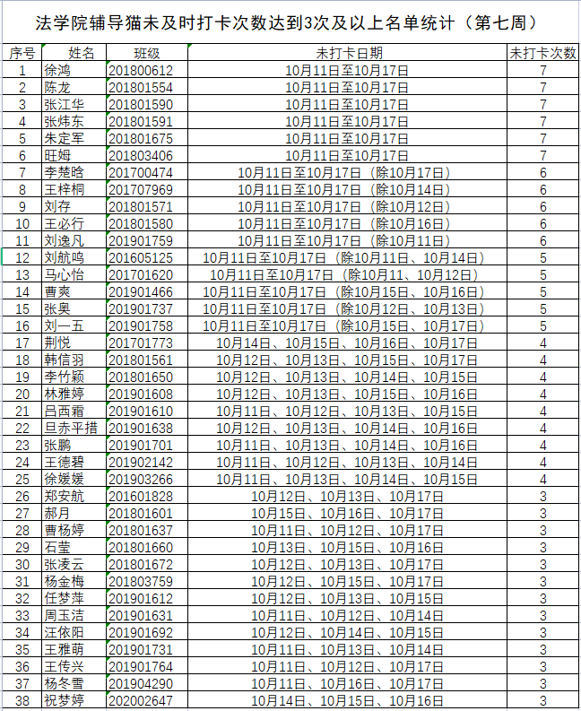 根据学校要求,2021年10月11日-10月17日(第七周)组织全体本科生进行每日“辅导猫”打卡。经分管辅导员、学工助理、班干部多次提醒,仍有38名同学未在规定时间内完成打卡,具体未打卡次数及日期如下:(表格显示)