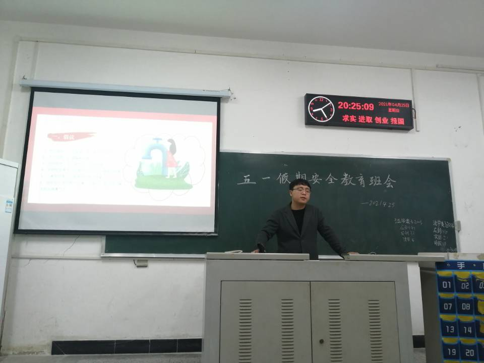 盛老师从假期安全出行、防溺水、运动安全和“专业分流”四个方面对班级同学进行了教育。首先,盛老师结合案例深刻地阐述了出行安全的重要性,提醒同学们拒坐黑车,遵守交通规则,按照程序履行请假手续。结合自身见闻,盛老师提醒同学们不要到危险水域戏水,并介绍了自身和他人落水时的紧急应对措施。结合运动安全典例和当前天气状况,盛老师提醒同学们运动健身需量力而行,谨防出现中暑等意外事件。随后,“五一”小长假即将来临,盛老师提醒同学们“非必要不离校”,离校必须严格遵守请销假手续,外出做好自身疫情防控,要对他人和自己负责。