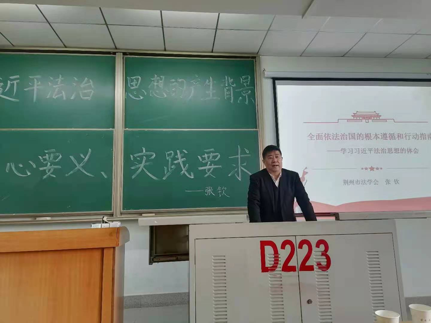 (通讯员:孟欣冉)3月21日下午,《全面依法治国的根本遵循和行动指南》主题讲座在13教D-223教室顺利举行。原荆州市司法局局长、政法委常务副书记、人大常委会副主任、现荆州市法学会会长、长江大学法学院客座教授张钦应邀主讲。本次讲座由法学院胡承武老师主持,法学院荆楚卓越法律人才实验班成员以及来自其他学院的同学到场参加了本次讲座。胡承武老师对张钦教授的到来表示热烈的欢迎,并向大家介绍了张钦教授的学术背景、工作履历以及对司法工作作出的卓越贡献。