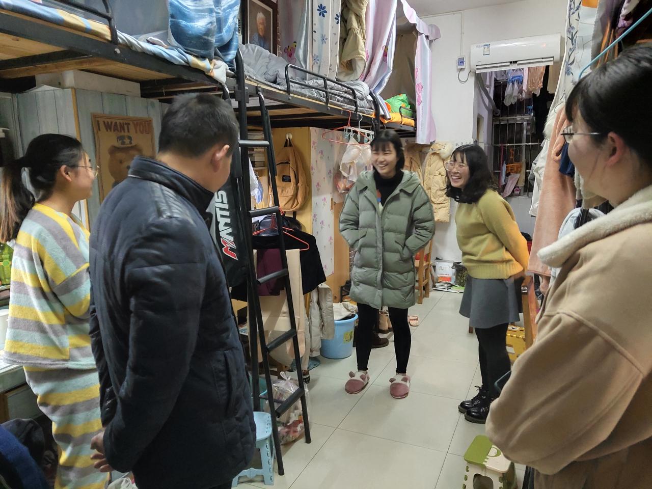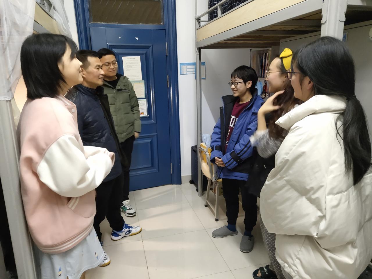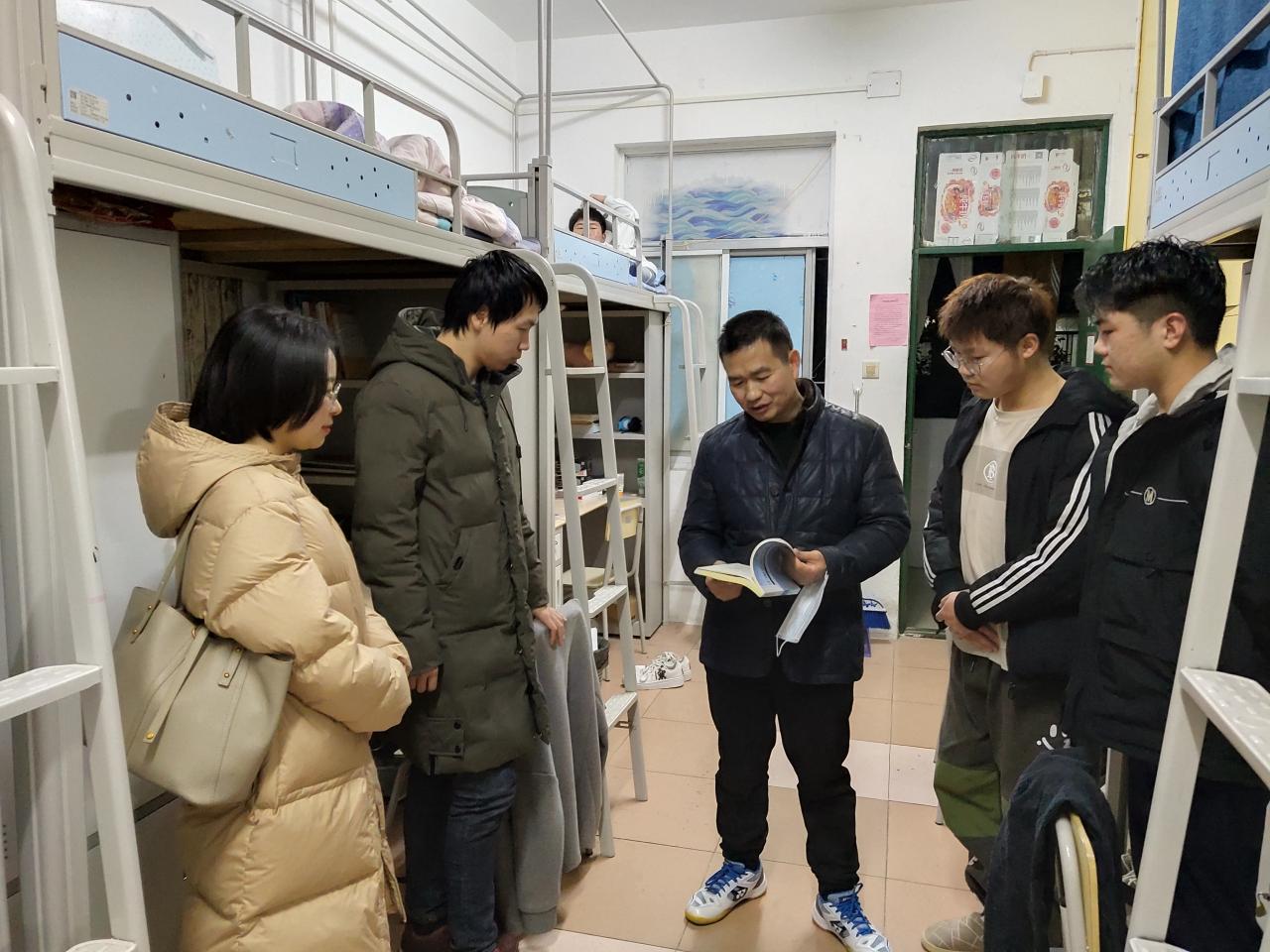1月2日晚,我院领导周胜美书记及辅导员周晓峰、盛文军到寝室看望2021年寒假留校学生。
