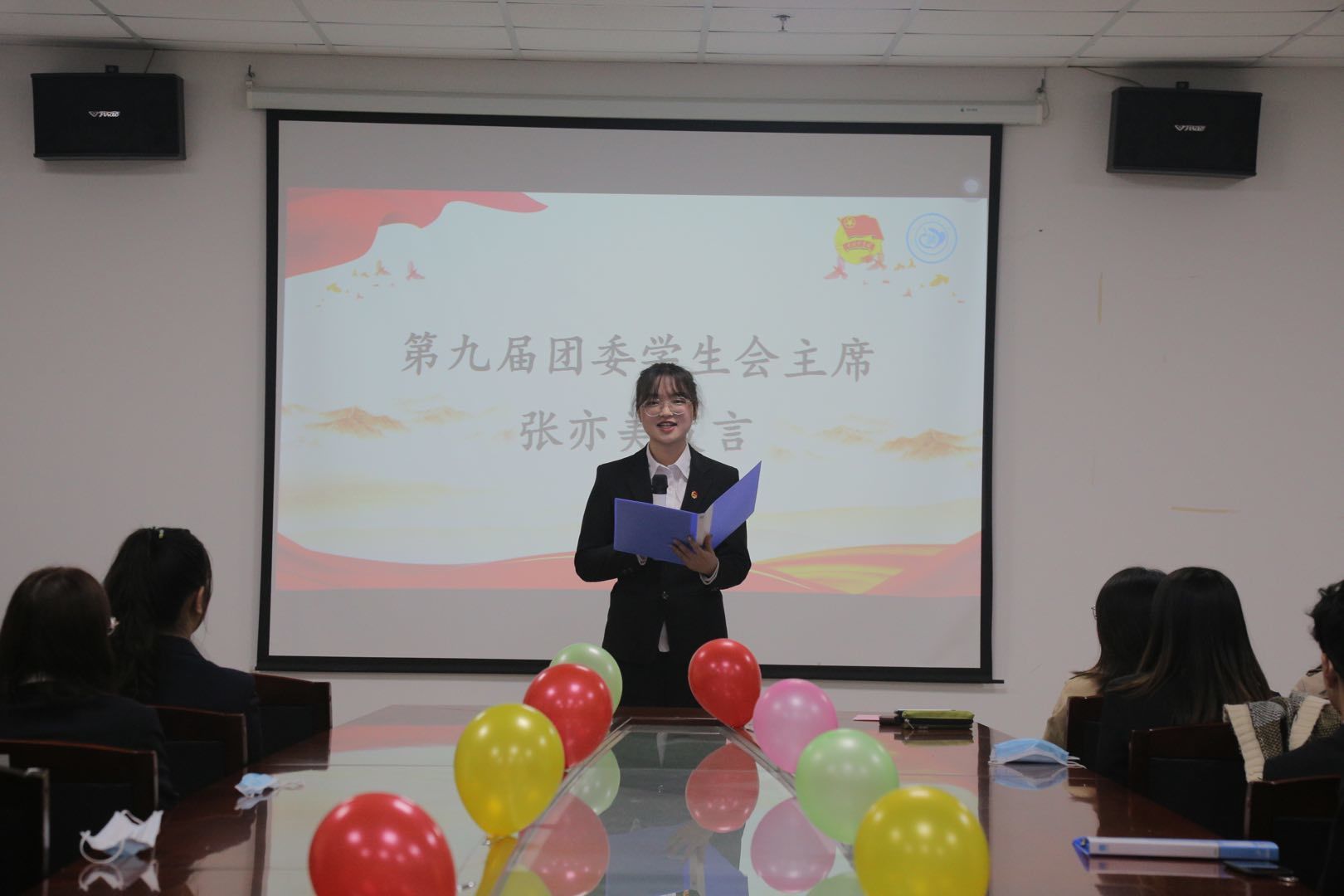 随后第九届团委学生会主席张亦美部长代表胡力布干事代表罗文浩依次进行发言,他们表达了对老师们的感激之情,为成员们的工作生活学习提出来几点实用的小建议,表示要合理安排学习工作生活时间,不忘初心,保持热情;要将自己融入学生会这个大家庭,建立学院与同学们间的纽带,以梦为马,不负韶华!紧接着进行受聘仪式,法学院第九届团委学生会全体成员被正式授予工作证与工作笔记本,代表着正式成为了这个大家庭中的一员。大会上还抽选部分部门的部长及干事发表工作感谢及未来期许。随后颁发第九届团委学生会纪念品。