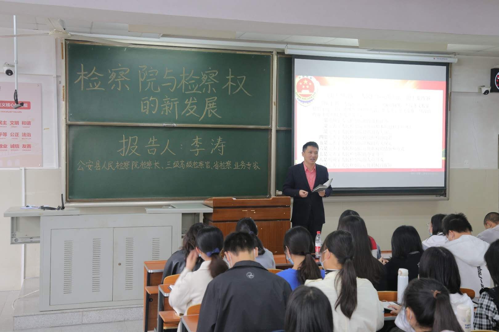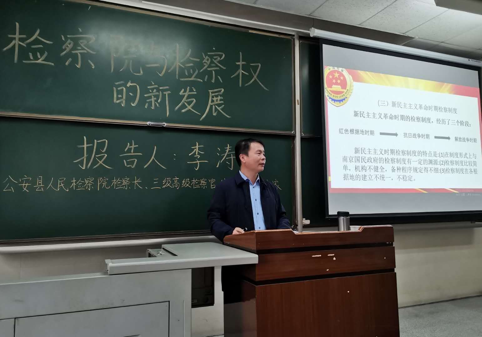 (通讯员:王梓桐)10月24日上午9点,我院在长江大学东校区主教107举办了“检察院与检察权的新发展”主题讲座。讲座由公安县人民检察院检察长李涛主讲,法学院院长李华成主持,出席本次讲座的有法学院党委副书记胡红霞以及实习实训中心主任陈群辉。