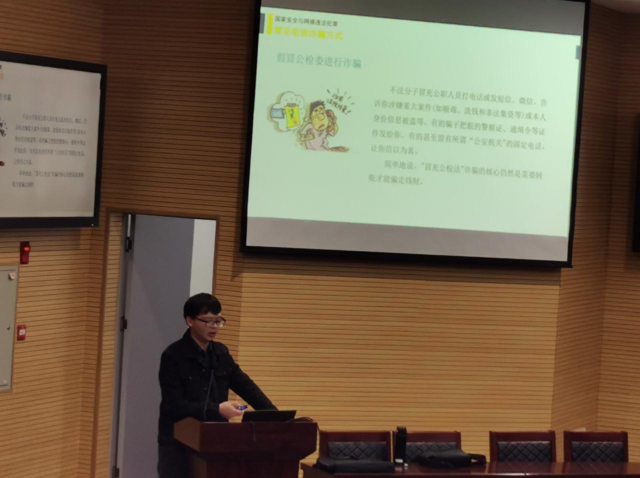 此次讲座主题分为考试安全、预防校园贷与金融安全、国家安全与网络违法犯罪、实习与社会实践安全和体育运动安全五大类。首先,杨老师对考试安全作出诠释,通过两个本校案例着重强调了考试诚信与考试安全。告诫同学们要诚信考试,做诚信文明大学生。随后,杨老师重点强调了预防校园贷与金融安全问题,通过多个案例,让同学们看清非法校园贷的“黑爪”,认识非法校园贷的严重后果。在国家安全与网络违法犯罪方面,杨老师指出当前威胁国家安全的诸多因素,大学生对国家安全应有充分理解,并呼吁大学生树立国家安全意识,提升维护国家安全的能力。最后,杨老师还介绍了我院的一些实习与实践活动,通过身边案例让同学们牢记惨痛教训。在体育运动安全方面,杨老师提醒同学们注意安全运动、健康运动。