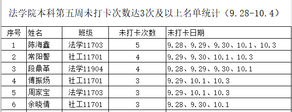 根据学校要求,2020年9月28日-10月4日组织全体本科生、进行每日辅导猫打卡。经分管辅导员、学工助理、班干部多次提醒,仍有6名同学未在规定时间内完成打卡,具体未打卡次数及日期如下:(表格显示)