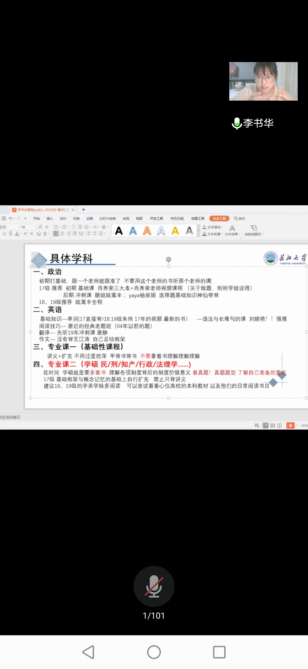 为充分吸取2016级学姐的考研经验,提高法学院的整体考研率,法学院于7月5日晚上7点30分开展了线上考研分享会,此次会议邀请了2016级李书华、程凯琦、程文赟三位学姐进行考研经验分享,此次分享会由舒勇担任主持,法学院学工办主任杨琳丽及法学院全体本科同学参与此次会议。