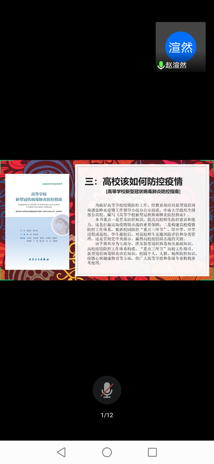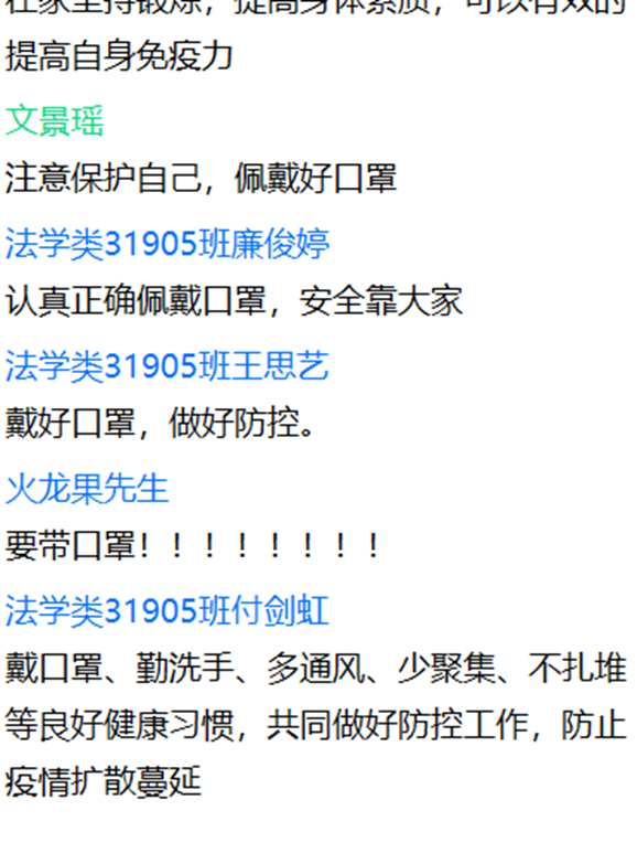 本次主题班会主要带领同学们学习了《公众科学戴口罩指引(修订版)》、《夏季空调运行管理与使用指引(修订版)》以及《高等学校新型冠状病毒肺炎防控指南》等文件,让同学们了解到“如何科学的戴口罩”、“夏季空调的使用与管理”以及“高校该如何防控疫情”的相关知识,并组织大家各自填写了一份关于“长江大学法学院全体学生对疫情防控学习情况的调查”的问卷,以帮助同学们加深对文件的认识。同时,同学们也在班会上分享了自己对疫情防控措施的理解。