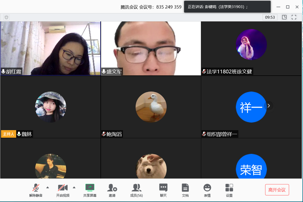 (通讯员 陶薇)4月6日晚7点,法学院在腾讯会议召开本学期第一次学生干部工作例会,党委副书记胡红霞,学工办主任兼团委书记杨琳丽,2019级新生辅导员盛文军及各班班长参与此次例会。