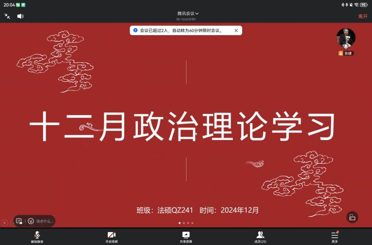 (通讯员 杨绚清)为深入学习贯彻习近平新时代中国特色社会主义思想,切实增强研究生群体的“四个意识”、坚定“四个自信”、做到“两个维护”,持续提升法学院研究生的政治理论素养与思想觉悟,深刻领会党的二十大精神的核心要义与实践要求,12月25日晚20:00,法学院研究生各班级以线上形式成功举办十二月政治理论学习班会。全体班级成员积极响应、踊跃参与,共同完成了一场内容充实、意义深远的理论学习之旅。