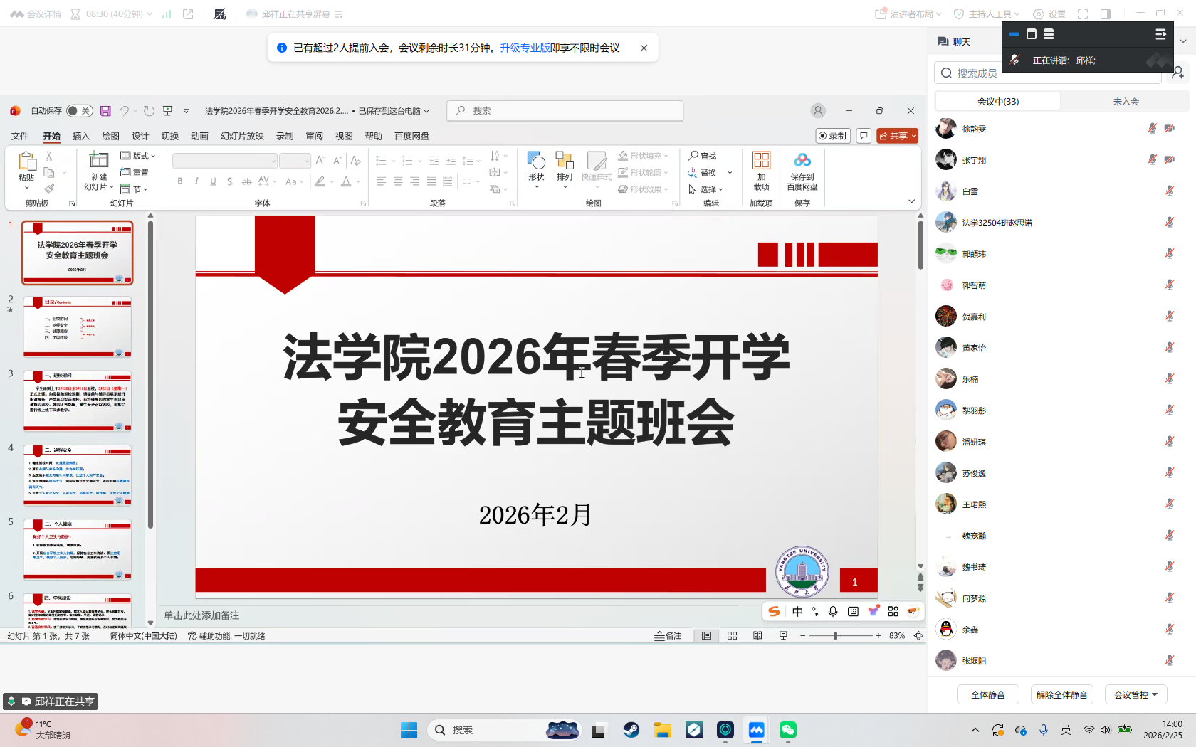 (通讯员 肖芳)为切实落实学校2026年春季学期开学工作部署,确保新学期开学各项工作平稳有序、学生安全顺利返校,2月24日与25日,法学院组织召开春季开学学生返校安全教育线上班会,层层压实责任、细化工作举措,为春季学期开学工作筑牢基础。