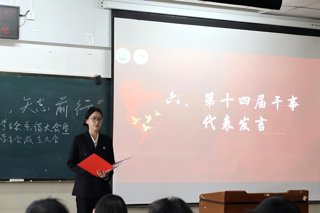 第六项议程中,第十四届团委学生会新干事代表龚怡上台发言。她以 “扎根泥土听真实声音,深入具体践知行合一” 为行动纲领,用昂扬的精神风貌与铿锵有力的话语,传递出新一代学生会成员的朝气、活力与实干决心,赢得现场阵阵掌声。