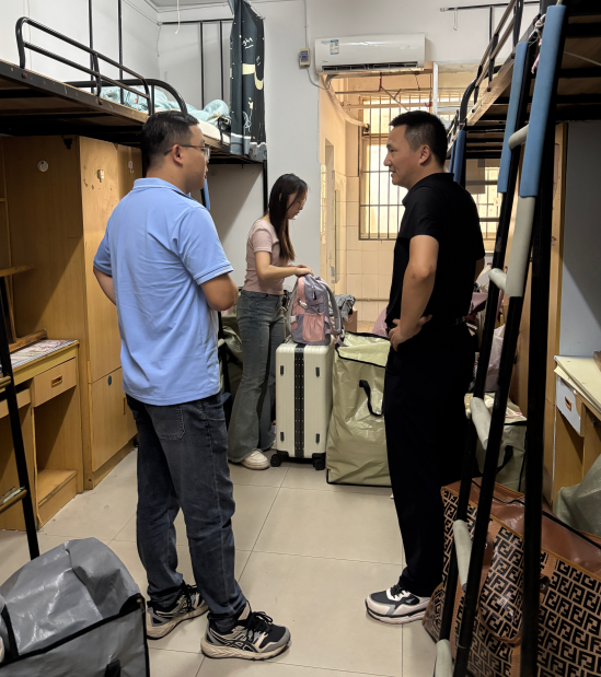李华成院长逐间走访南苑宿舍楼,细致查看宿舍基础设施、生活配套等情况。在与学生的交流中,他以“搬迁过程是否遇到搬运难题”“新宿舍设施使用是否顺畅” 等具体问题切入,认真倾听同学们对新环境的适应感受。针对部分学生提出的储物空间规划建议,李院长现场记录并表示将协调后勤部门跟进优化。他特别强调:“东校区是学术探索的新起点,同学们既要尽快适应生活节奏,更要在新环境中保持学习热情,学院永远是大家坚实的后盾。”走访宿舍的过程中,李院长还亲切地与学生家长进行交流。