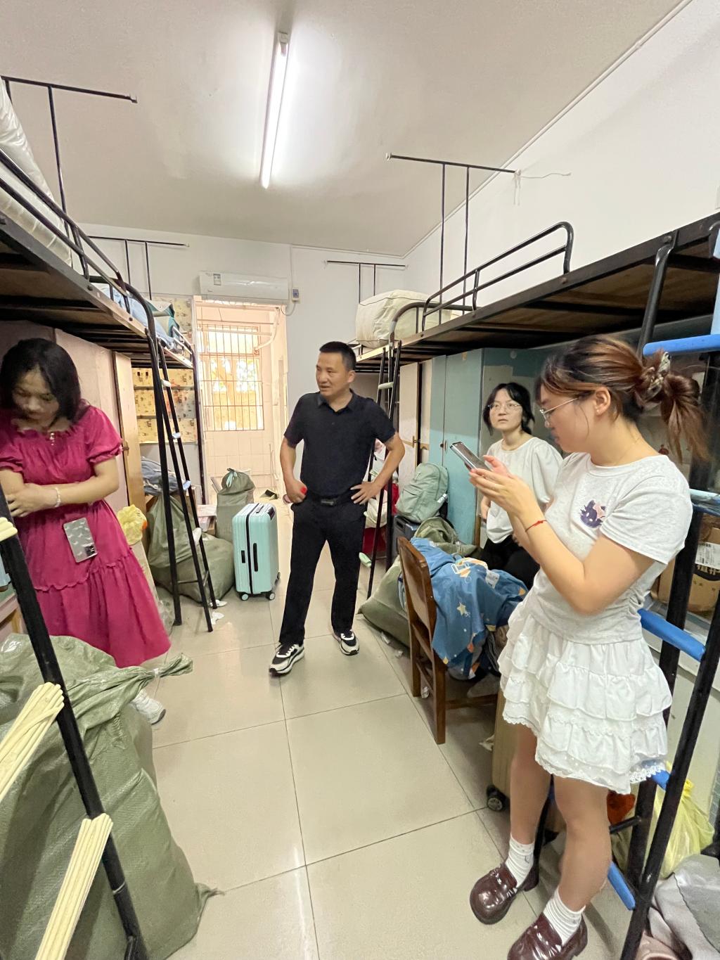 各班主任同步深入所带班级宿舍,以“面对面谈心” 的方式开展走访工作。法学12401班班主任胡骑兵老师针对外地学生饮食适应问题,详细介绍了校区周边餐饮设施;法学12405班班主任邱祥老师则结合专业学习特点,为学生规划书桌收纳提出实用性建议。老师们纷纷鼓励同学们:“宿舍是大学生活的重要场景,希望大家在共建整洁环境的同时,培养互助友爱的寝室文化,让南苑成为温暖的第二个家。”