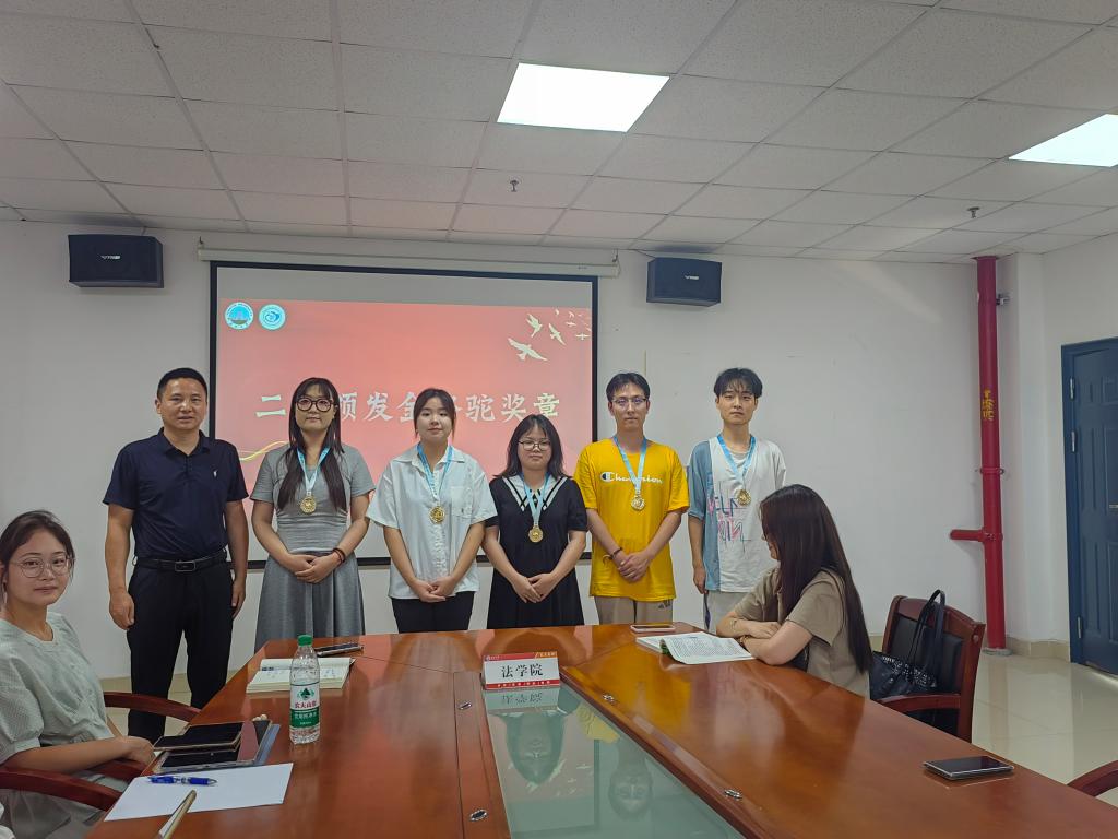 随后,院长李华成为学生代表颁发金骆驼奖章,以表彰他们勇于扎根基层、奉献青春的精神。院长亲手将奖章佩戴在学生代表胸前,对他们的选择表示高度赞扬,“金骆驼奖章象征着坚韧、担当与奉献,你们用实际行动诠释了这些品质,是法学院的骄傲。”