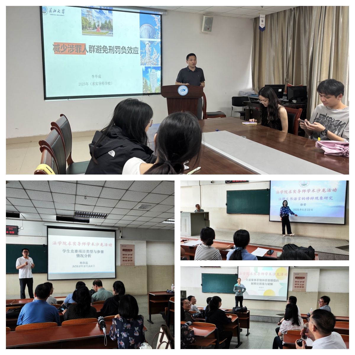 5月22日,法学院“求实导师学术沙龙”讲座在文科楼B区203会议室和东12-204同时举行。本次活动以“法学理论与实务的对话”为主题,特邀李华成、杨春磊、程爱军、徐莹四位导师担任主讲嘉宾,吸引了15位硕士生导师及60余名研究生、本科生参与,现场学术氛围浓厚,师生互动热烈。