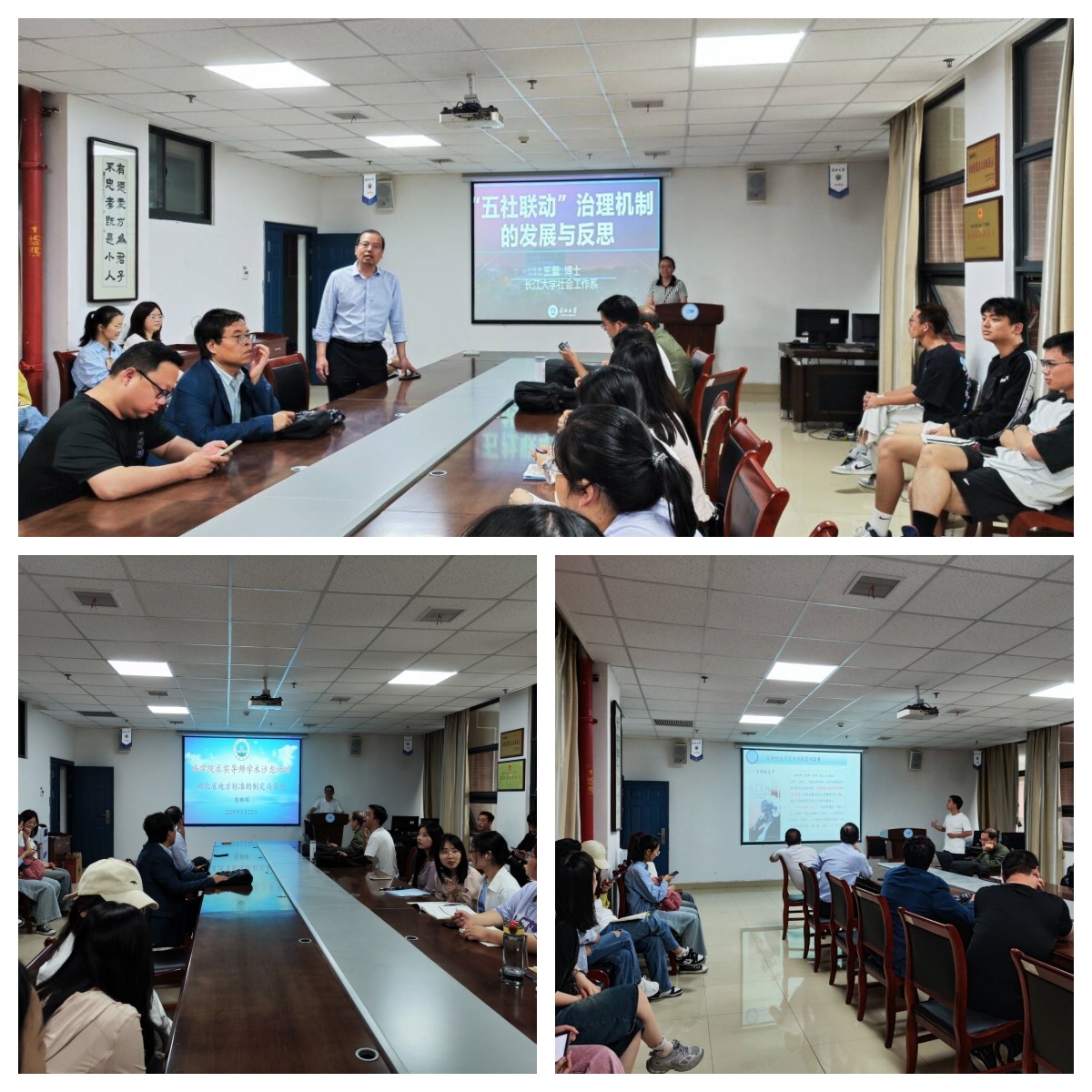本次沙龙特邀法学院五位导师围绕社会治理、法学理论及实践展开深度分享。王蕾导师以《“五社联动”治理机制的发展与反思》为题,系统梳理了“五社联动”在基层治理中的实践路径,并结合案例探讨其优化方向;杜厚扬导师聚焦社会热点问题,通过《未成年人有偿陪侍问题社会化治理》的讲座,从法律与社会治理双重视角剖析现象成因,提出综合治理建议;朱帅导师则以《复杂系统下的自组织》为题,引入跨学科视角,阐释自组织理论在法学与社会治理中的应用潜力;邱祥导师围绕经典法哲学命题,以《法律是什么?——以哈特〈法律的概念〉为线索展开》为题,带领师生回溯法理学核心争议,激发对法律本质的思辨;陈群辉导师结合地方实践,在《湖北省地方标准的制定与实施》中解析地方立法的科学性与可操作性,为标准化建设提供理论支撑。