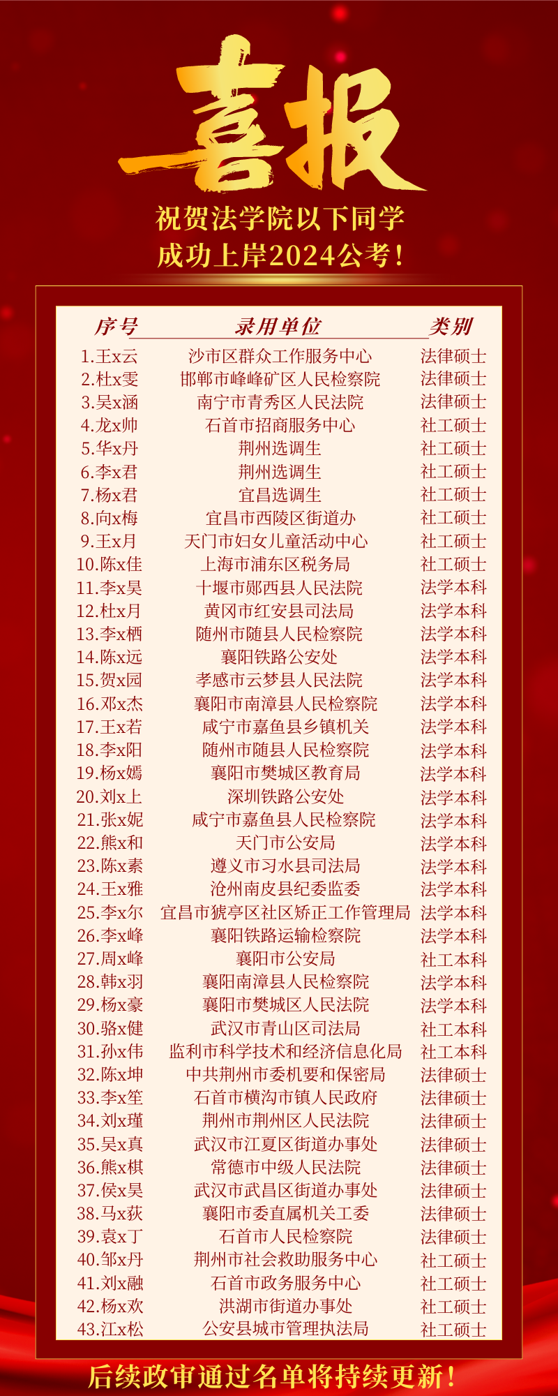 初步统计,我院将有43名毕业生在7月份后进入相应工作岗位。学院2024届毕业生(含研究生)共有305名,本年度各类公职录用人数占比约15%。在湖北省2024年计划招录选调生1000名人员中,长江大学被录用人数为15名,其中法学院有3名应届毕业生入围。
