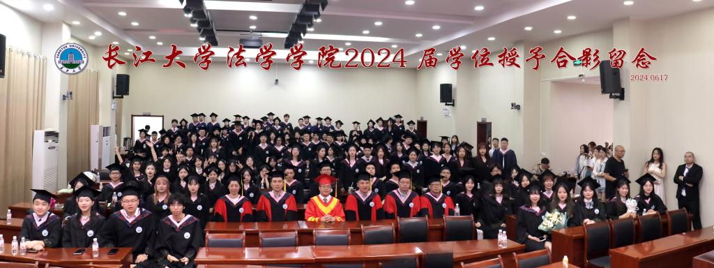2024年6月17日,长江大学法学院在就业宣讲大厅隆重举行2024年毕业生学位授予仪式。校党委常委、纪委书记、省监委驻长江大学监察专员刘靖君、法学院院长李华成、法学院副院长唐飞、法学院副院长杨春磊、导师代表胡承武、刘庆出席本次仪式,200余名2024届毕业生及家长代表参与本次仪式。学位授予仪式由法学院党委副书记严星主持。