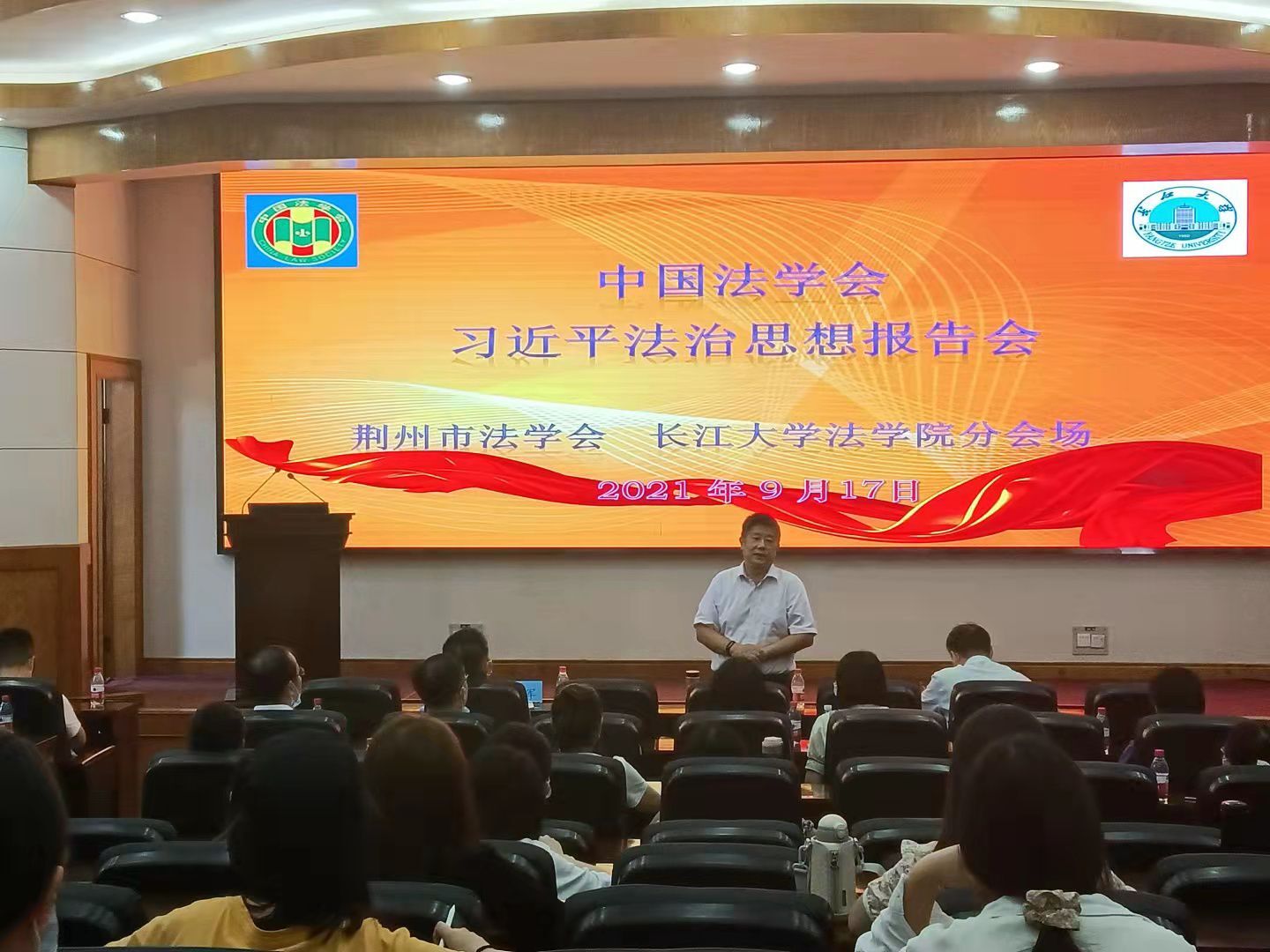 报告会由中国法学会、习近平法治思想研究中心主办,在中国法学会融媒体中心演播室以网络直播形式举办,荆州分会场设在长江大学11教学术报告厅。荆州市法学会机关、荆州区、沙市区法学会负责人,长江大学法学院教师和研究生共80余人在分会场集中参加学习。