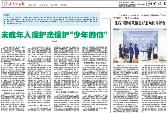 6月1日为国际儿童节也是新修订的《中华人民共和国未成年人保护法》生效之时,《人民政协报》刊发法学院杨春磊博士的普法时评《未成年人保护法保护“少年的你”》。