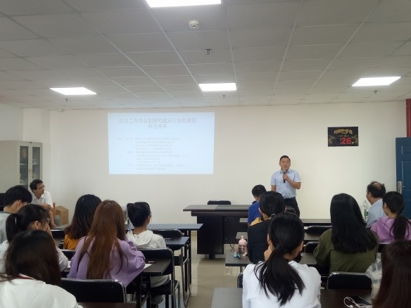 9月21日上午,在文科大楼1011室,法学院举办了“社会工作专业制度构建及行业发展现状与未来”的主题讲座,学院党委书记周胜美、社会工作专业的有关老师和学生参加了讲座。