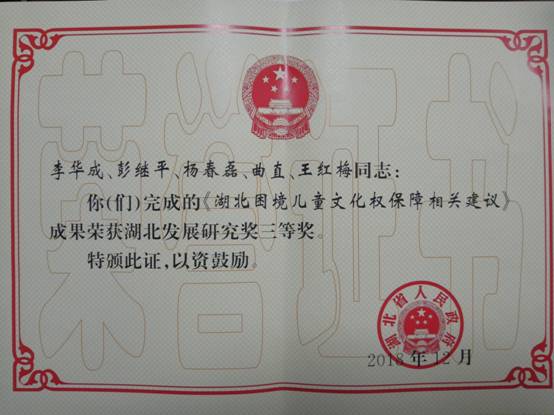近日,湖北省人民政府发文《省人民政府关于颁发湖北发展研究奖的通报》(鄂政发[2018]52号),荆州市人大常委会委员、法学院副院长李华成博士团队研究成果《湖北困境儿童文化权保障相关建议》获三等奖。
