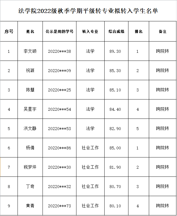 根据本科生院《关于开展2022级普通本科生秋季学期转专业工作的通知》、《长江大学普通本科生专业分流与转专业管理办法(试行)》(长大校发[2019]260号)和《法学院2022级本科生秋季学期转专业实施方案》,经学生本人申请,本科生院资格审核,本院考核。按照综合成绩=必修课平均成绩*40%+面试成绩*60%,综合成绩分由高到低排序,经学院党政联席会议讨论通过以下9名同学为拟接收人员,现予以公示。