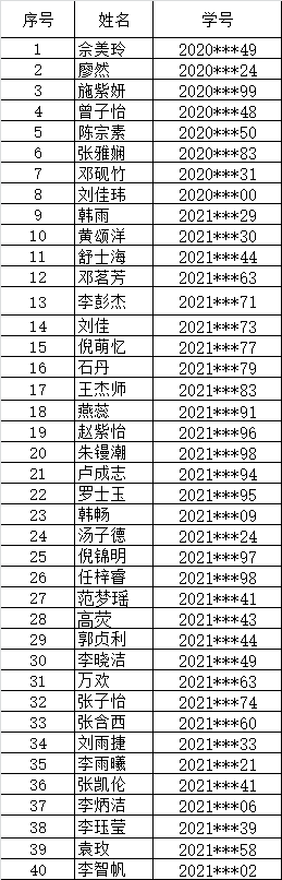 按照《长江大学“卓越法律人才”实验班第二期遴选通知》精神,经过同学个人申请、学院组织审核,40名同学资格审查合格,公示如下,若对公示名单有异议,请向学院反映,电话:8062153 。