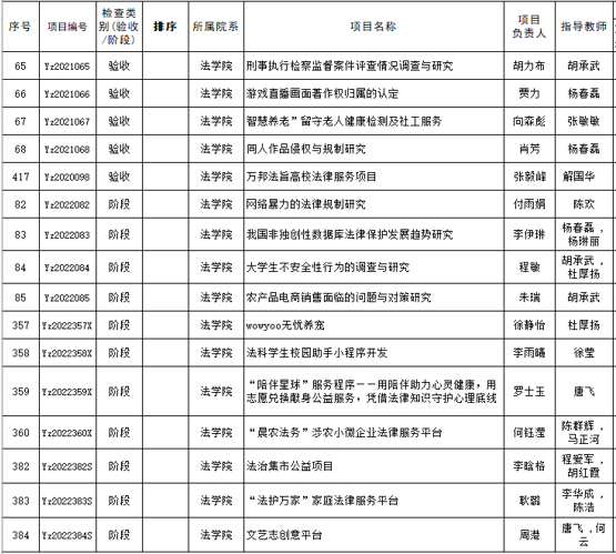 根据2023年大学生创新创业训练计划项目结题验收、阶段检查工作的通知精神,法学院按照大学生创新创业中心的统一部署,学院组织评审专家对如下项目进行答辩评审。