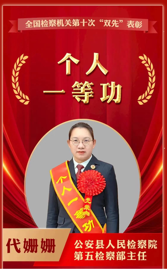 12月20日,最高人民检察院召开全国检察机关队伍建设工作会议暨第十次先进集体、先进个人表彰大会,法学院校友、公安县人民检察院第一检察部主任代姗姗荣获全国检察机关“个人一等功”。